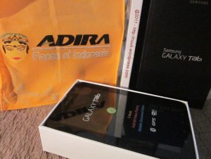 Setelah Acara Inti-nya selesai tibalah pengundian doorprize berupa 1 ipod, 1 ipod touch dan 1 Samsung Galaxy Tab yang diambil dari wadah yang berisi kartu nama yg dikumpulkan di meja registrasi. tak ada firasat apa-apa, tak berharap dapat hadiah juga karena biasanya peruntungan saya untuk mendapatkan hadiah yang diundi itu tak pernah bagus. Satu meja kami yang berisi 12 orang blogger menyimak pengundian hadiah tersebut. hadiah pertama dan hadiah kedua tak ada satupun dari kami yang ber 12 itu yang dipanggil. Tiba-tiba nama saya dipanggil dan dinyatakan berhak untuk membawa pulang satu set Samsung Galaxy Tab, woww… antara kaget dan senang , seumur hidup belum pernah mendapat hadiah doorprize yang nilai-nya sangat besar 🙂